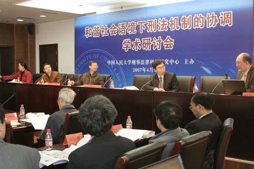 本次研讨会开幕式于4月7日上午举行,中国人民大学刑事法律研究中心执行主任黄京平教授主持,中国人民大学刑事法律研究中心主任戴玉忠教授、最高人民法院副院长熊选国大法官、最高人民检察院副检察长朱孝清大检察官、中国人民大学常务副校长袁卫教授、中国人民大学法学院院长王利明教授、中国人民大学刑事法律研究中心名誉主任高铭暄教授先后致辞。各位领导及学者们表示,在我国构建和谐社会的进程中,刑事法制建设的重要意义显而易见,刑法机制的协调是其中一项非常重要的议题,无论在立法层面,还是在司法层面,都有着重要的导向作用。对这一议题进行探讨和研究,对我国刑事立法和刑事司法实践都将大有助益。