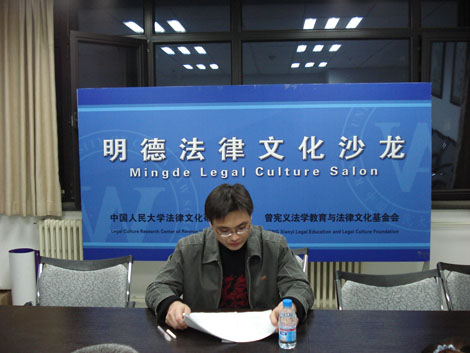 4月9日晚上7点,我院“明德法律文化论坛”举办第四十三期,本期论坛为法律文化沙龙活动,由我院法律史教研室博士研究生顾荣新主讲、与会师生共同探讨的形式进行。法律史教研室博士研究生和硕士研究生10余人参加了此次沙龙。
