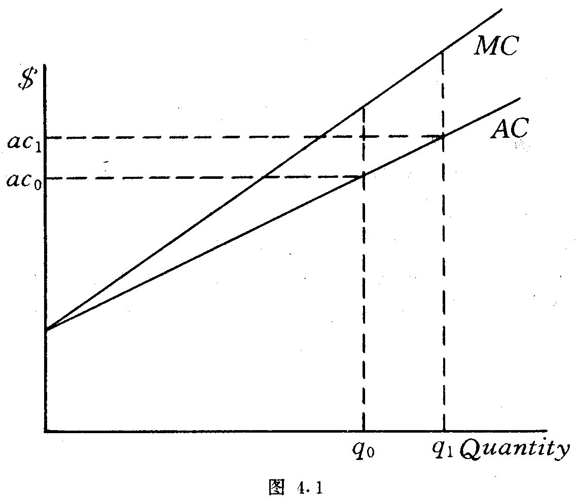 这在图4.1中得以表明。假设卖方只有可变成本,所以AC既为平均可变成本也是平均总成本。MC是卖方边际成本。如果像图4.1中那样,边际成本呈上升趋势,那么平均可变成本也会上升,因为由不断的产量增长而造成的总成本的上升将会被分摊到企业的全部产品中去。没达成的销售可能已将企业产量从qo扩展到了q1,从而导致平均成本从aco上升到ac1。如果没达成的销售的损害赔偿要通过从契约价格[(q1-qo)×aco(一个已知数)]中减除而得出,而不是由从[(q1-qo)×ac1(一个未达成的销售量的假设数)〕中减除而决定,那么企业将会得到过度的违约补偿。(边际成本和其他成本的概念将在第9和第11章中得到更为全面的论述。)但当企业意在使企业产量均衡地小量增长时(图4.1中的比例是很大的),那么新契约引起的成本变更也是小量的。就这样的契约而言,契约履行前企业的平均可变成本可能很近似于履行契约的实际成本。